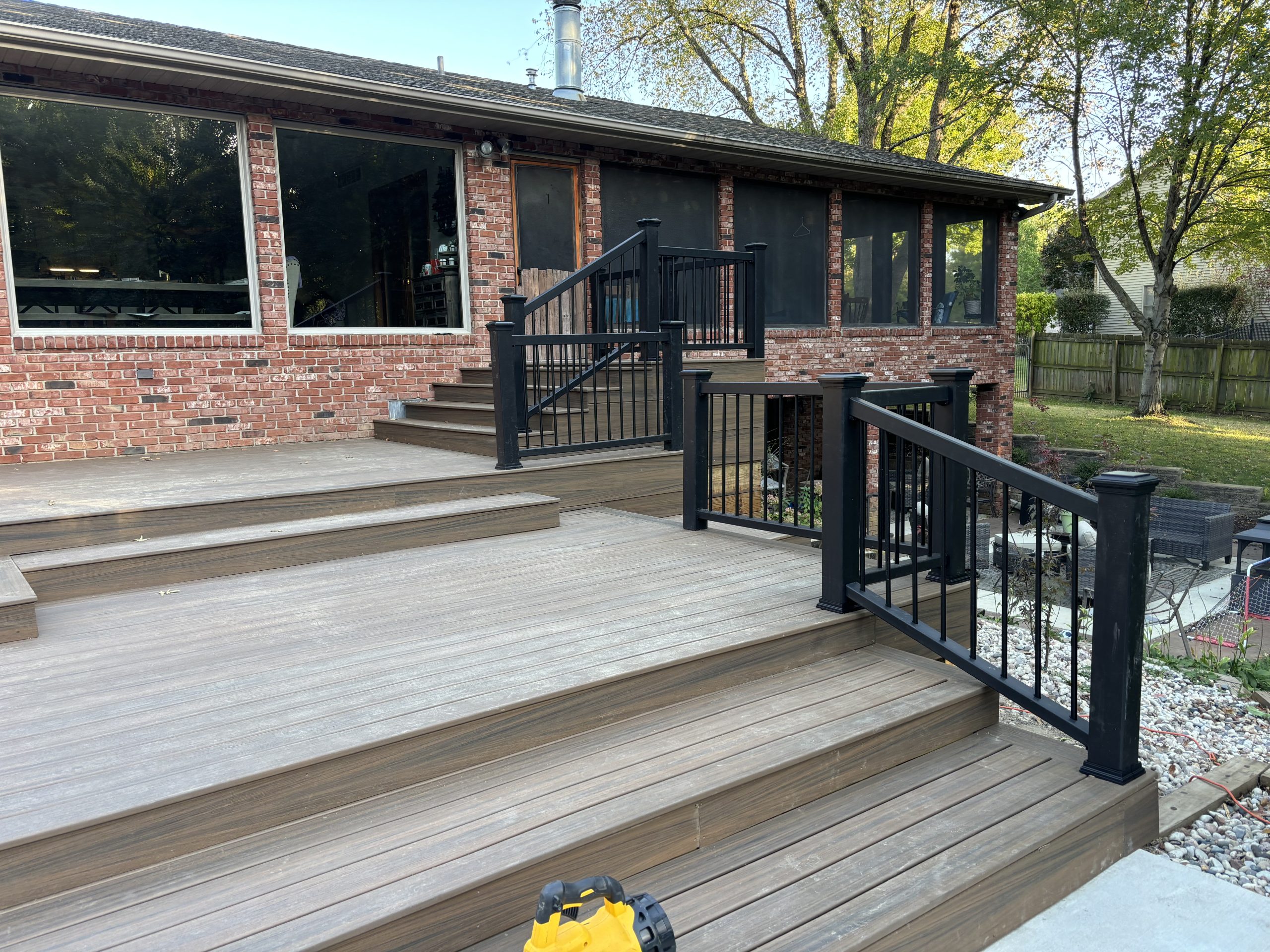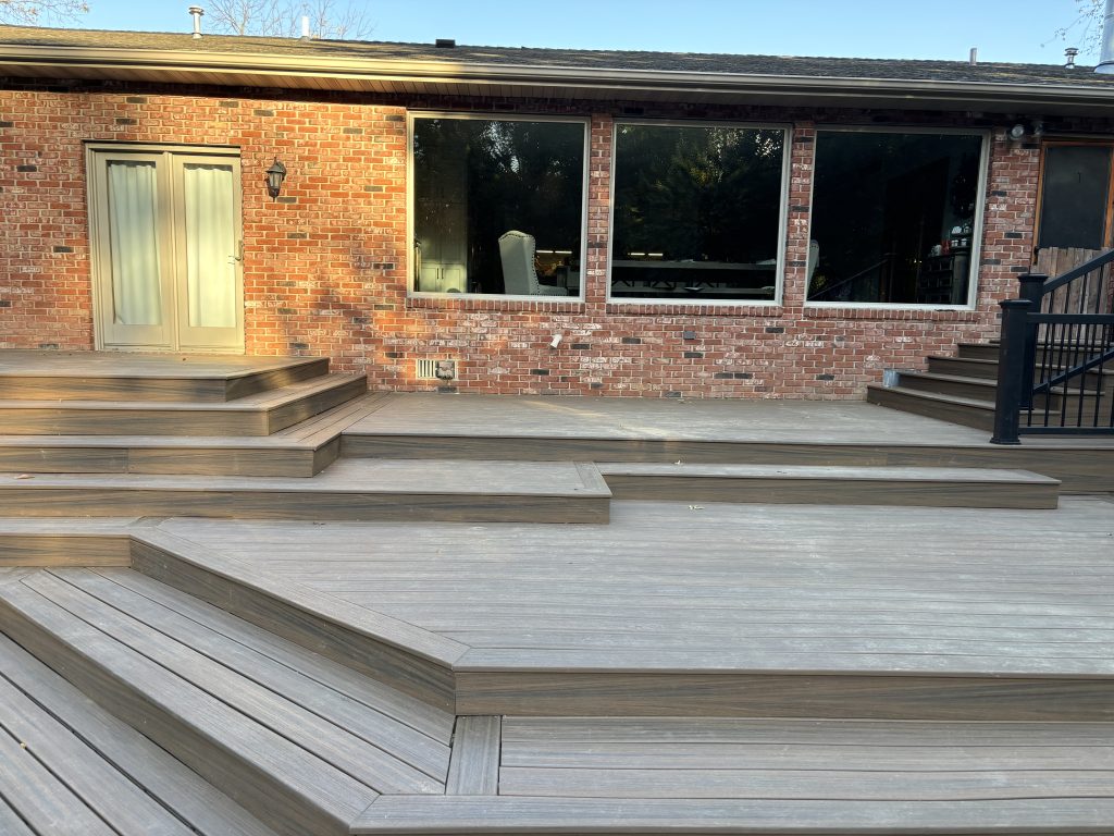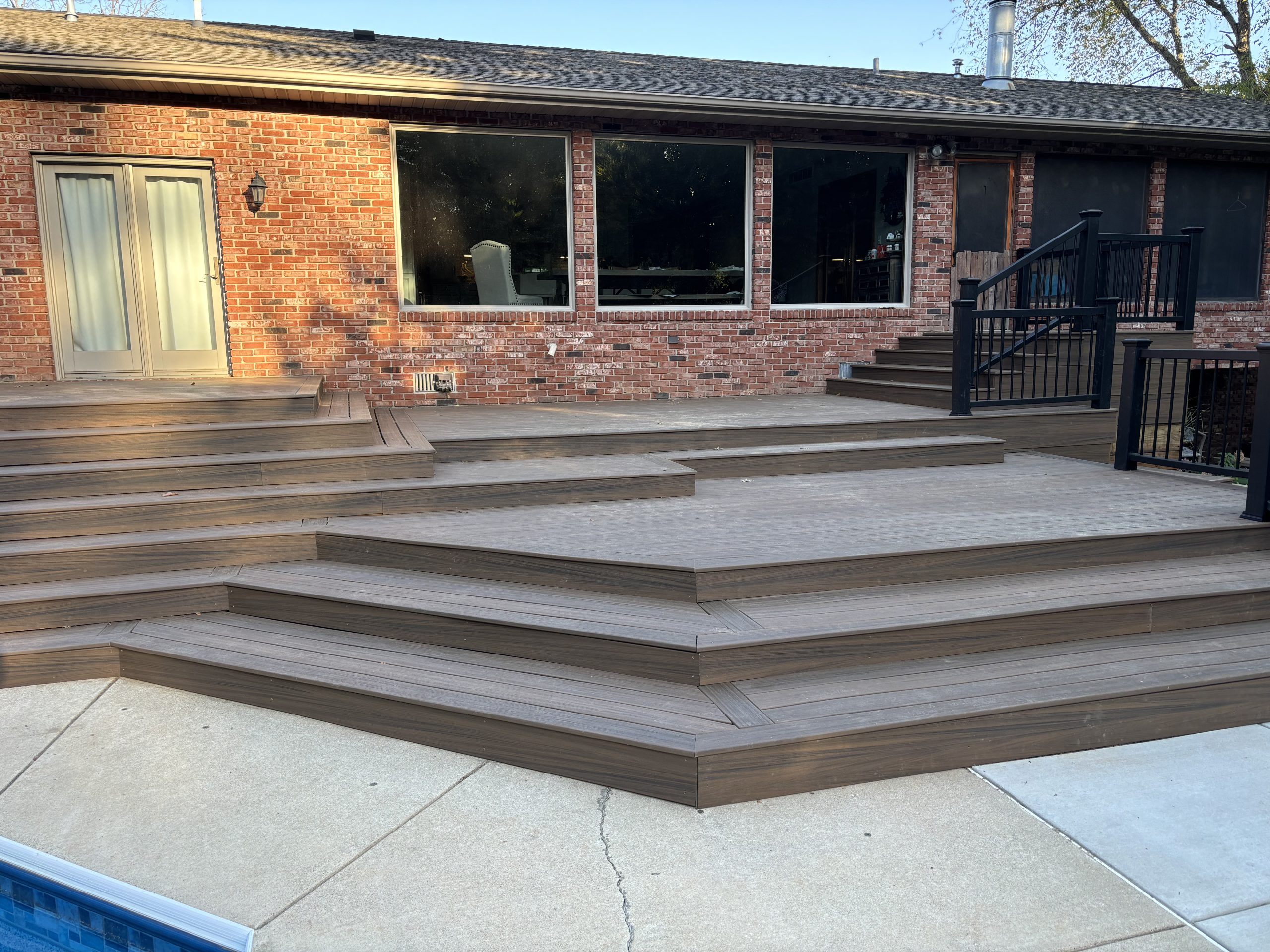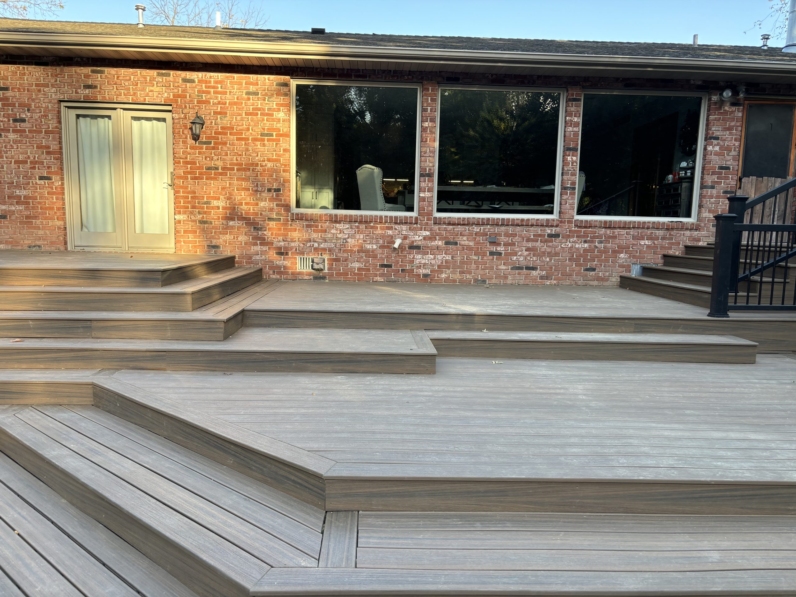 Upgrade your backyard with a custom multi-level composite deck! Our latest project in Athens, Illinois, features a unique design with multiple decks and wraparound steps, combining style, functionality, and durability.